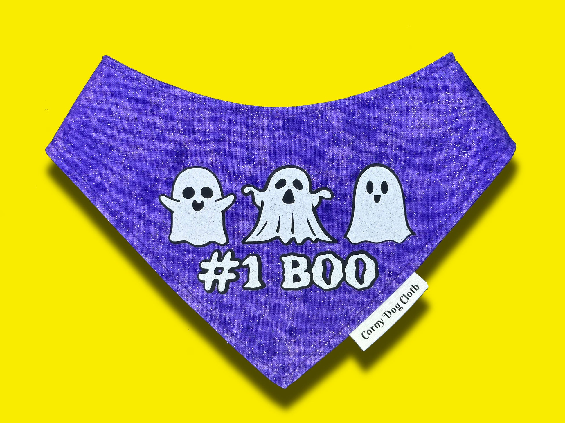 Introducing the purple glitter ghost dog bandana, a stylish and fun accessory that will surely have tails wagging! This bandana is crafted with a vibrant purple glitter fabric that catches the eye and adds a touch of sparkle to your furry friend's ensemble. Adorned with adorable glitter ghosts, it brings a playful and spooky element to any occasion. The bandana proudly displays the phrase "#1 Boo," letting everyone know that your pup is the ultimate Halloween companion. Designed with convenience in mind, it features snap-on closure, ensuring easy and secure attachment to your dog's collar. Your fur baby will be ready for any festive gathering with this eye-catching purple glitter ghost dog bandana!