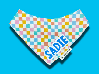 This colorful checkered dog bandana is a vibrant and stylish accessory that adds a pop of fun to your dog's look. It features a convenient snap-on design for easy and secure fastening, making it hassle-free to put on and take off. Personalized with your dog's name, this bandana offers a unique and charming touch tailored just for your furry friend. Perfect for everyday wear or special occasions, it combines comfort, durability, and personality in one fashionable piece.