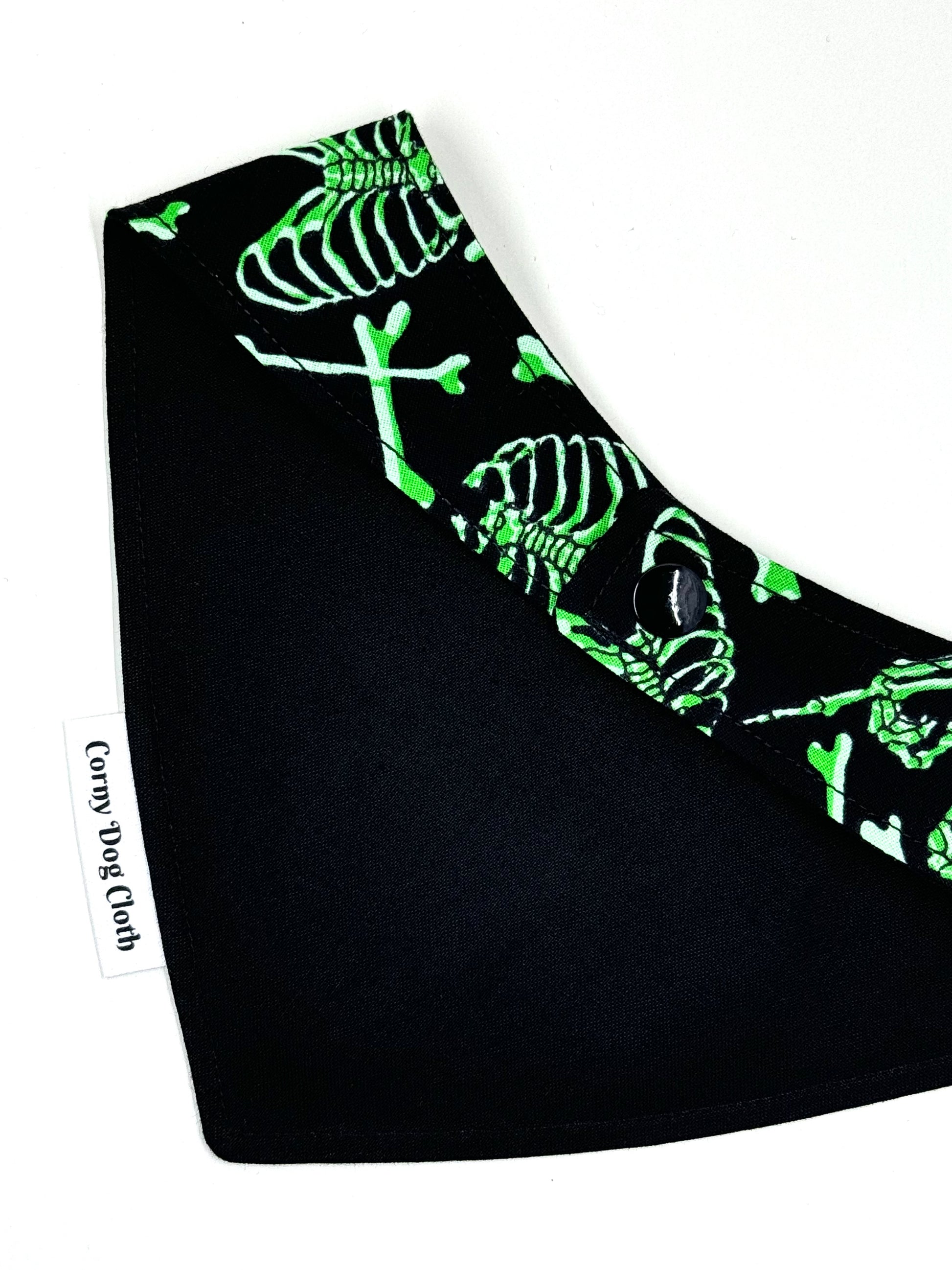 Introducing this mesmerizing neon glow-in-the-dark skeleton dog bandana, a striking accessory for your furry friend! This bandana features neon skeletons that glow in the dark, adding an element of fun and spookiness to your pet's ensemble. Adorned with a glitter skull and the sparkling message "Bone Fanatic," this bandana is the perfect choice for Halloween or any spirited occasion. The snap-on closure ensures easy and secure wear for your pup.