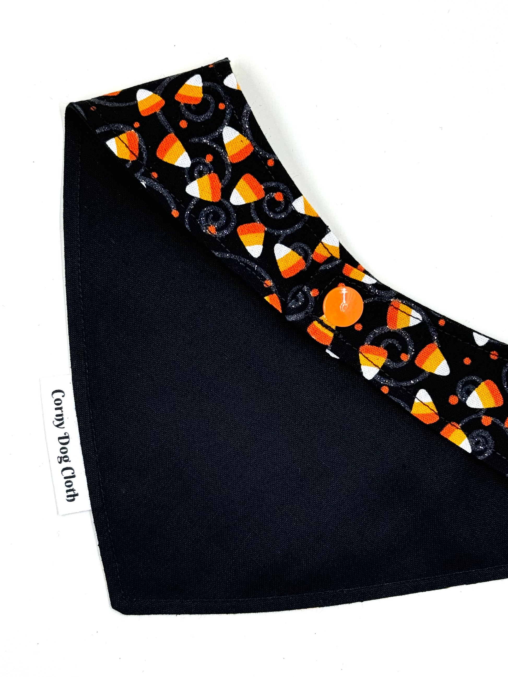 Introducing our stylish black dog bandana, featuring delightful candy corn designs and a touch of glitter for added sparkle! This bandana is the perfect blend of fun and glamour for your furry friend. The customizable feature allows you to add a personal touch, making it a unique accessory. With snap-on closure for ease of wear, your pup will be looking fabulous in no time!