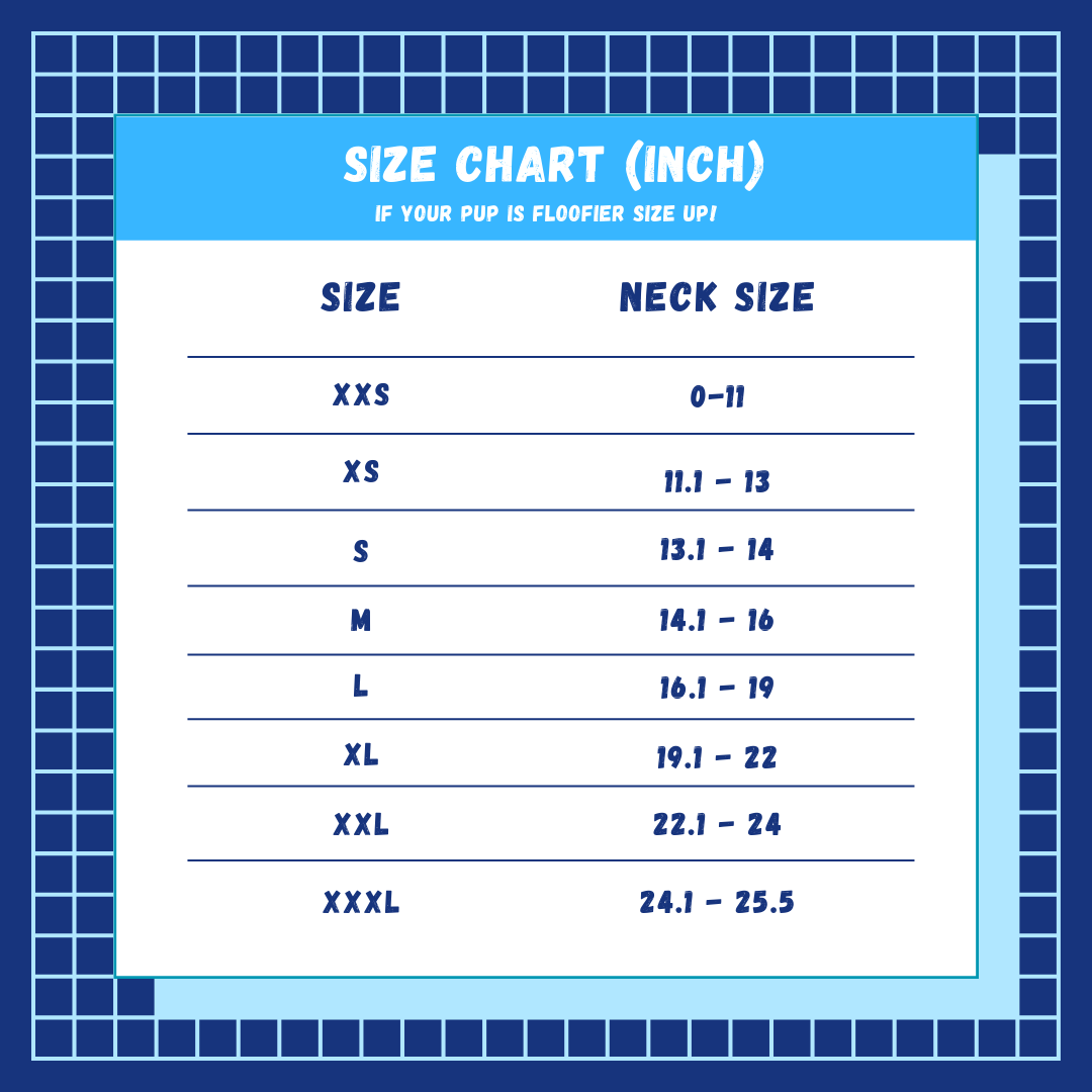 The best way to make sure the size you select will fit your furry friend is by measuring his/her neck. All measurements below are in inches and based off of the circumference of the dogs neck.