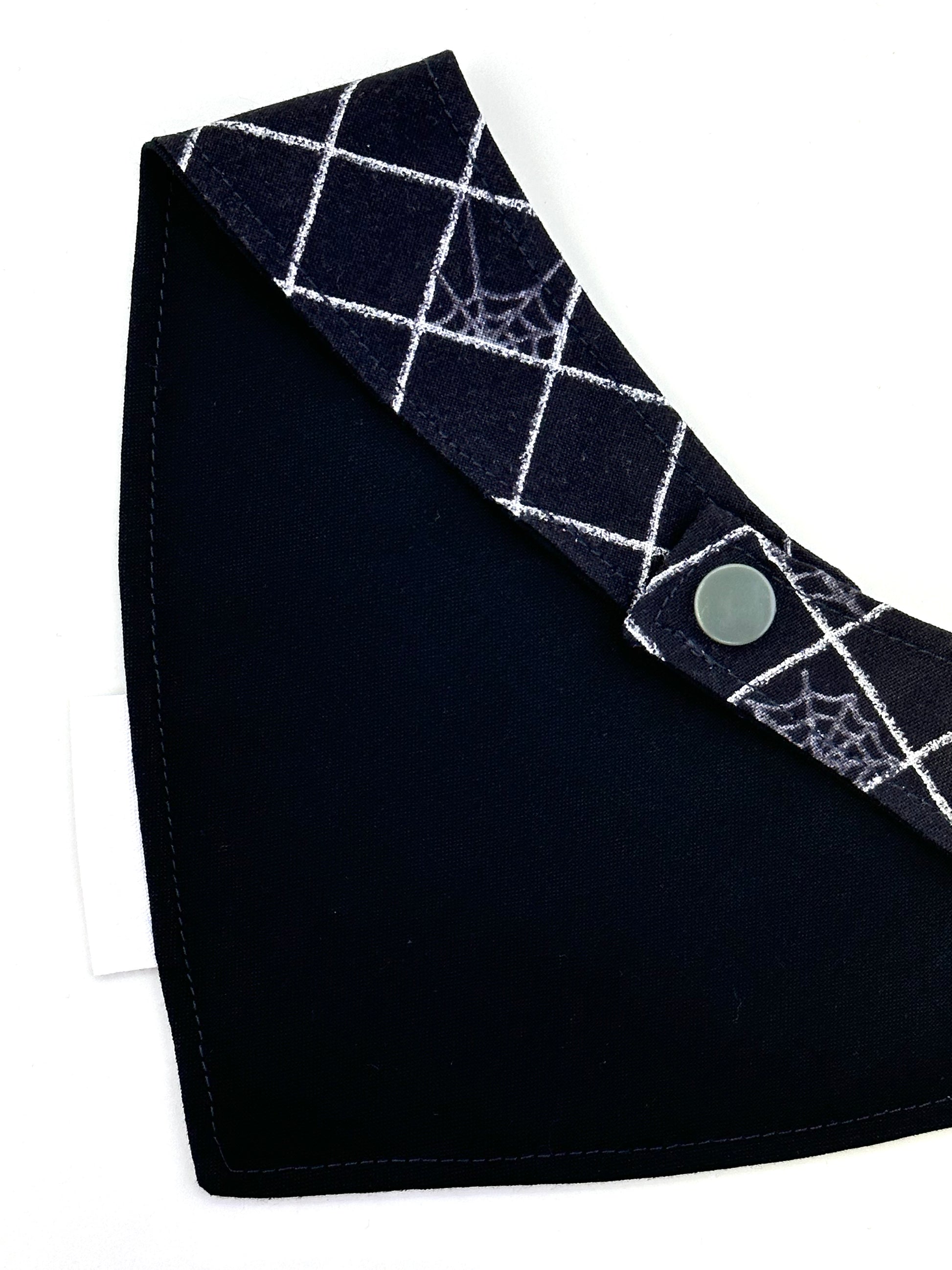 Introducing the black spider web dog bandana! This trendy accessory is designed for fashion-forward canines who love to make a statement. Featuring a sleek black color accented with intricately woven spider webs, this bandana adds a touch of spooky charm to any pup's outfit. But the real showstopper is the white glitter spider embellishment, positioned perfectly to catch the light and add a whimsical touch. Your furry friend will surely draw attention and receive compliments wherever they go. In addition to its stunning design, this bandana offers personalized customization options. Add your dog's name or initials to make it truly their own. This personalized touch not only showcases their unique personality, but also ensures that their bandana won't be confused with any other canine's. Easy to wear, the bandana features a snap-on closure for hassle-free fastening and a secure fit. With the black spider web dog bandana, your furry friend is sure to steal the show and turn heads wherever they venture. Get ready for compliment overload as this stylish accessory becomes their new favorite fashion statement.