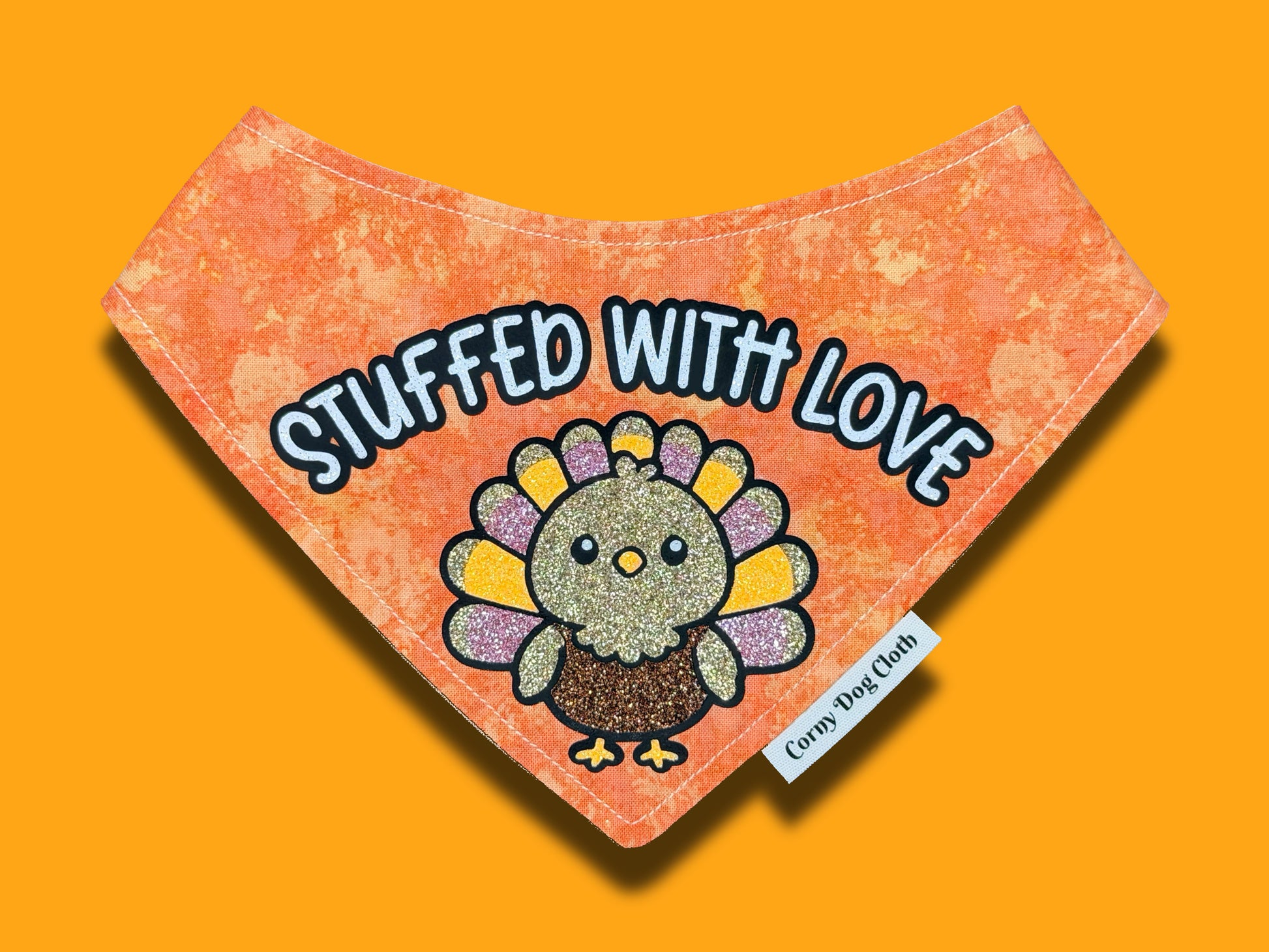 This festive dog bandana features a vibrant orange tie-dye design that brings warm autumn energy to your pup’s style. A cute turkey decorates the front, paired with the sweet phrase “Stuffed with Love”. Made with soft fabric and an easy snap-on closure, it’s the perfect accessory for Thanksgiving celebrations or cozy fall walks.