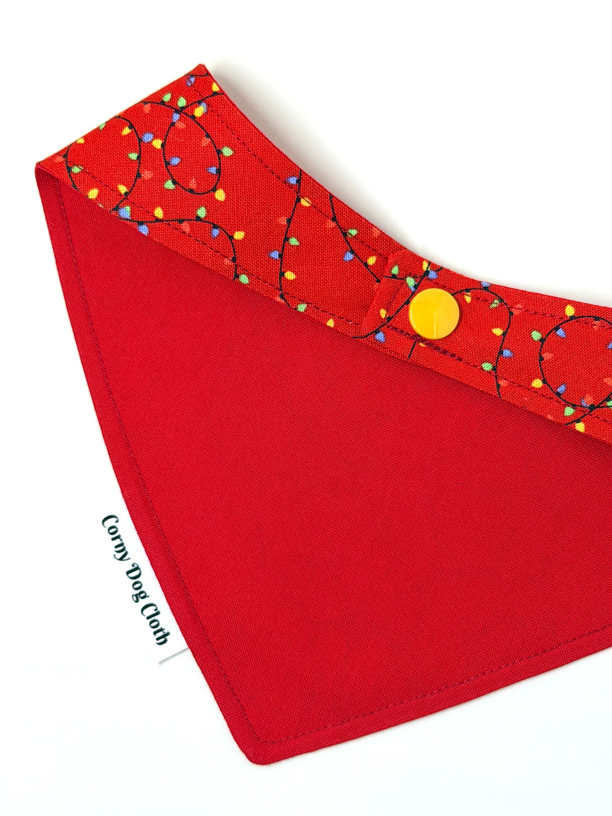This festive dog bandana is a merry and bright accessory for your furry friend. In a classic red color, it showcases the fun phrase "Let's Get Lit" in a playful font. Adorned with cheerful Christmas lights, this bandana is sure to add a spark of holiday spirit to your pet's ensemble. Easy to snap on, it's perfect for adding a touch of festive cheer.