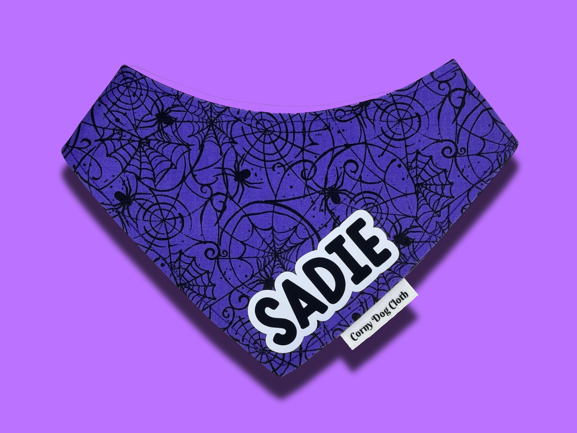 Introducing our customizable purple dog bandana, the perfect accessory for your furry friend this Halloween season! Adorned with intricate spider web patterns, this bandana adds a spooky and stylish touch to your pup's look. The customizable feature allows you to add your dog's name. With convenient snap-on closures, this bandana is not only fashionable but also comfortable for your beloved pet to wear. Make your dog stand out with this unique and festive accessory!