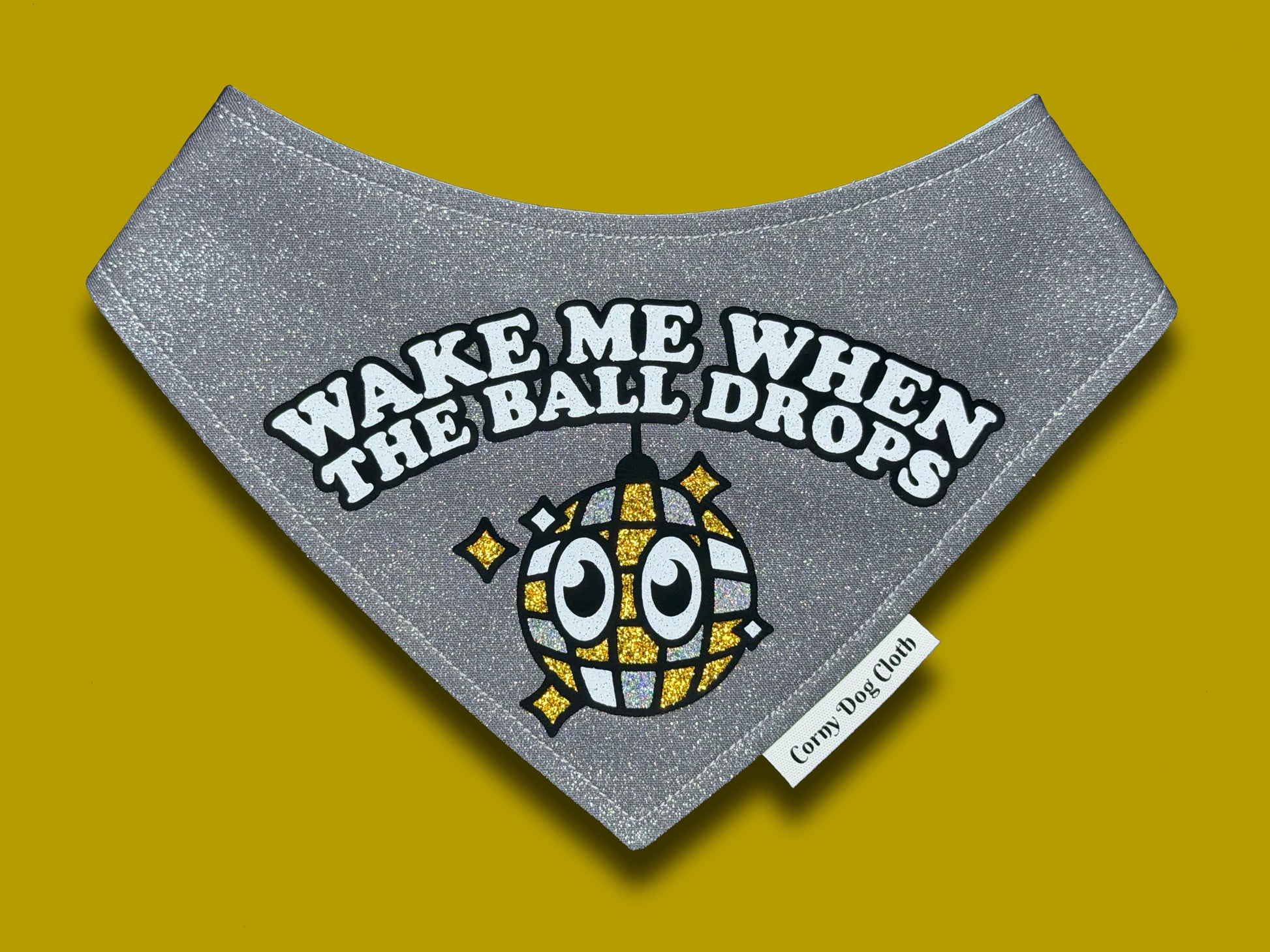 This gray glitter dog bandana is a must-have for any party pup. It features the fun phrase "Wake Me Up When The Ball Drops" with an adorable disco ball design that sparkles with every move. The snap-on style makes it easy to wear and ensures a comfortable fit, perfect for ringing in the New Year or any festive occasion.