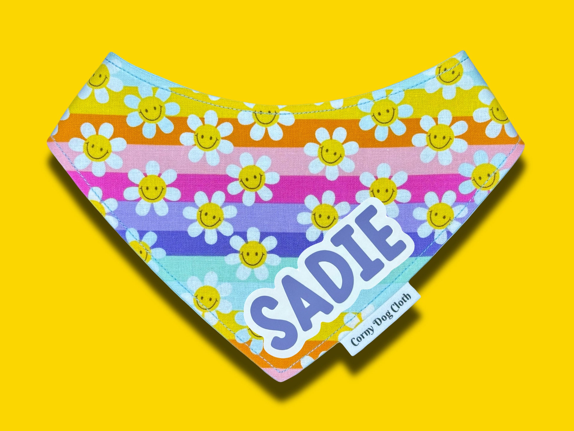 Brighten up your pup’s look with this colorful, personalized dog bandana! Adorned with cheerful smiley daisy prints, this snap-on accessory is as adorable as it is easy to wear. Add your pet’s name for a custom touch and let them spread smiles everywhere they go.