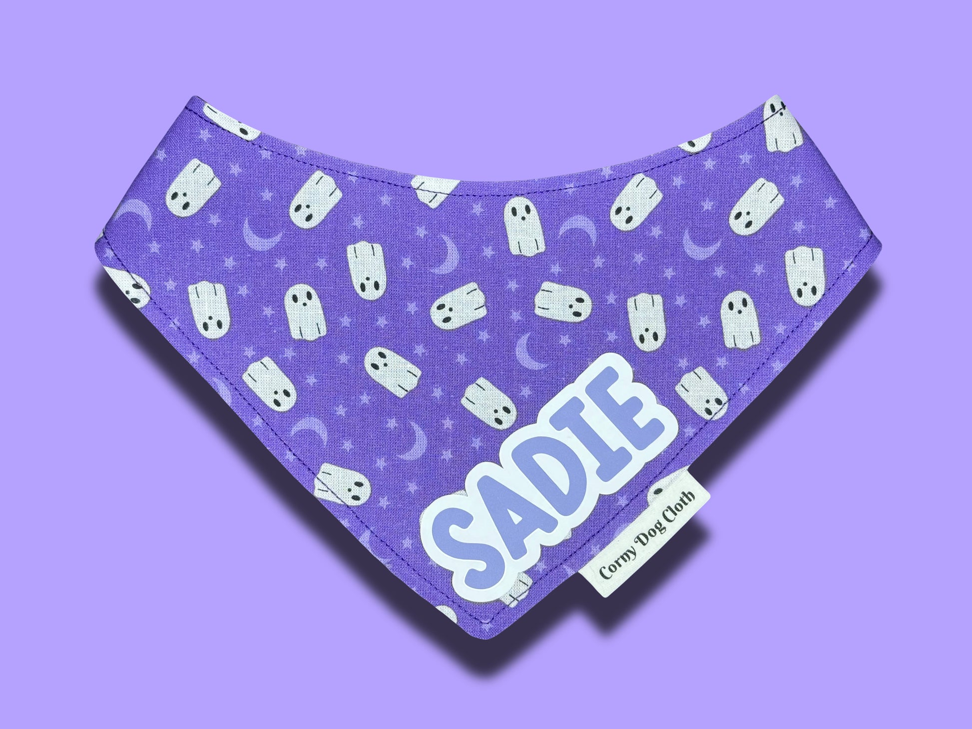 Add a touch of spooktacular style to your furry friend with this purple dog bandana featuring cute ghosts. This customizable bandana allows you to personalize it with your pet's name. With a convenient snap-on design, dressing up your pup in this adorable accessory is a breeze. Get your pup ready for Halloween in a fun and fashionable way with this ghostly bandana!